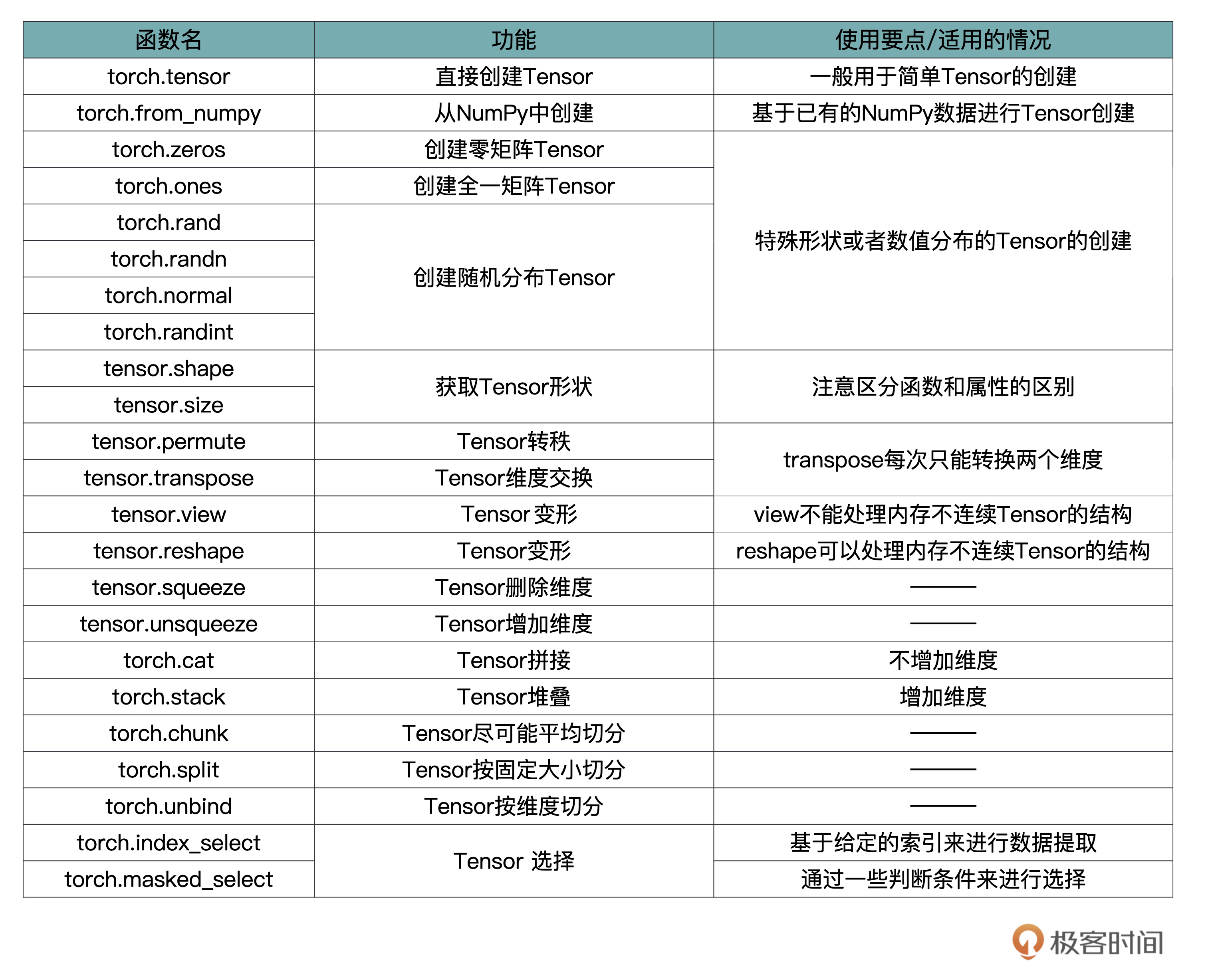 这里我特意给你梳理了一张表格,总结归纳了Tensor中的主要函数跟用法。不过这些参数咱们也不用死记硬背,我们在使用的时候,根据需要灵活查询相关的参数列表即可。