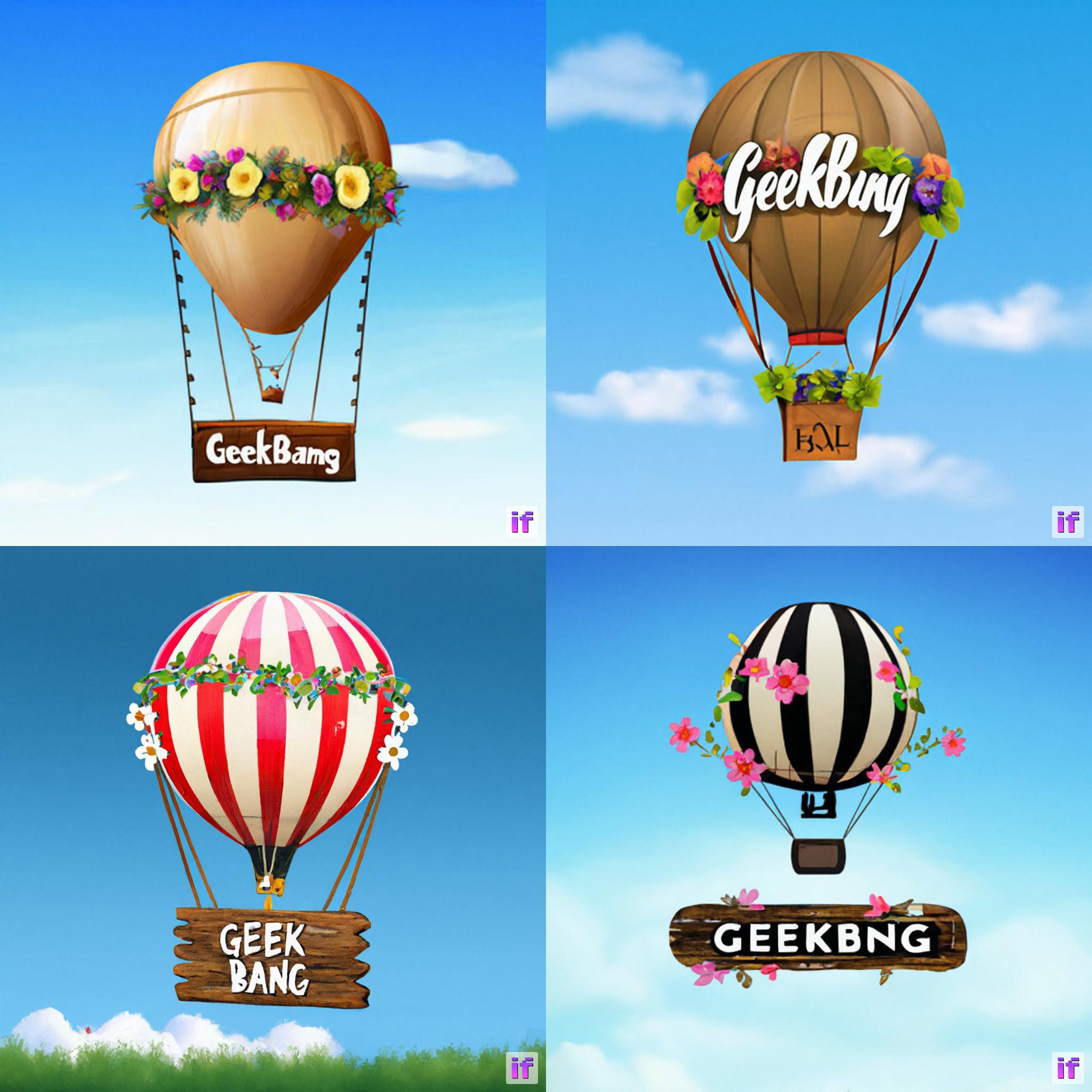 我们可以再体验一下DeepFloyd模型的Text-in-Image能力,比如我们要求其绘制这样一幅画:一个飞行在天空的热气球,挂着一个边缘镶嵌满鲜花的木板,木板上写着“Geekbang”。