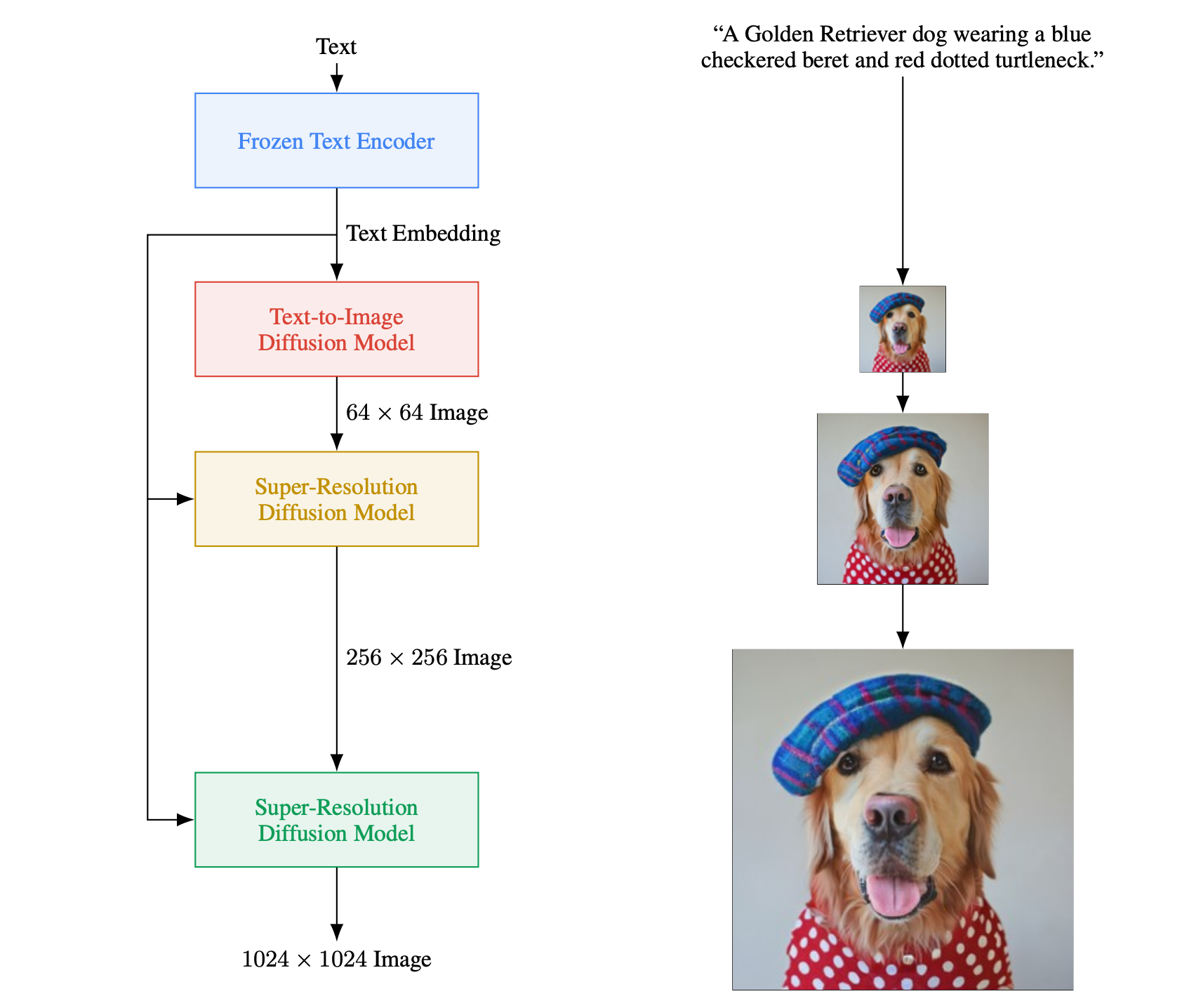 可以看到,文本描述经过文本编码器得到文本表征(Text Embedding),该文本表征不仅用于引导低分辨率图像的扩散生成,也用于指导连续的两个超分模块发挥作用。和我们前面学的DALL-E 2类似,Imagen首先会生成64x64分辨率的低分辨率图像,然后经过连续两次基于扩散模型的超分模块,将图像分辨率提升至256x256、1024x1024。