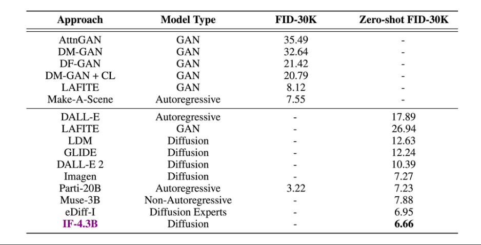 DeepFloyd的作者对各个生成模型的效果做了评测,表格中Zero-shot FID-30K表示生成图像的真实感分数,该数值越低越好。