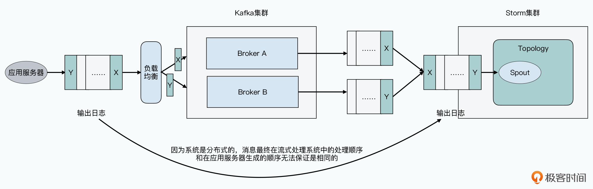 其次,是Kafka里,对于消息是没有严格的“顺序”定义的。也就是我们无法保障,先从应用服务器发送出来的消息,会先被处理。因为下游是一个分布式的集群,所以先发送的消息X可能被负载均衡发送到Broker A,后发送的消息反而被负载均衡发送到Broker B。但是Broker B里的数据,可能会被下游的Consumer先处理,而Broker A里的数据后被处理。