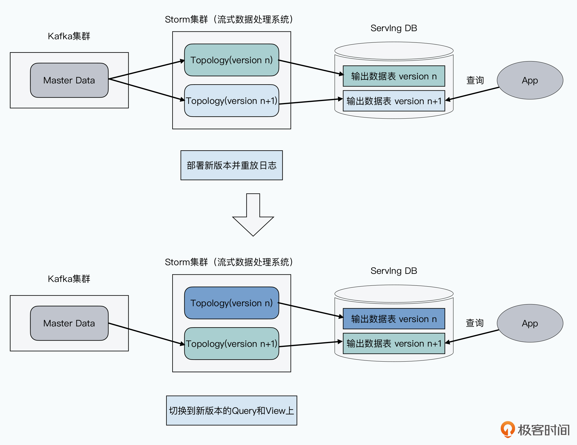 在Kappa架构下,如果要对Query进行修改,我们原来的实时处理层的代码可以先不用动,而是可以先部署一个新版本的代码,比如一个新的Topology上去。然后,我们会对这个Topology进行对应日志的重放,在服务层生成一份新的数据结果表,也就是视图的一个新的版本。
