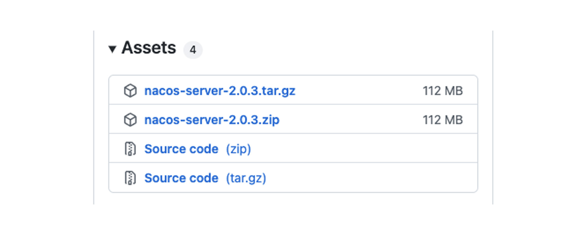 Nacos 2.0.3 Release note下方的Assets面板中包含了该版本的下载链接,你可以在nacos-server-2.0.3.tar.gz和nacos-server-2.0.3.zip这两个压缩包中任选一个下载。如果你对Nacos的源码比较感兴趣,也可以下载Source code源码包来学习。