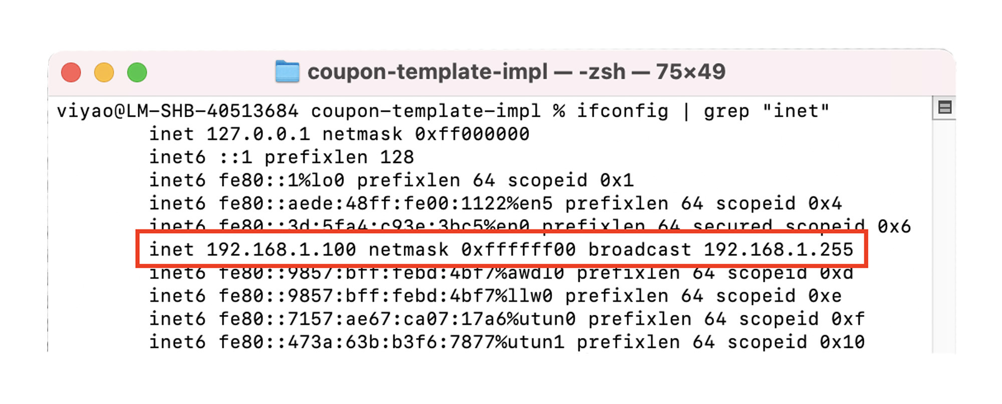 如果你使用的是mac或者linux系统,可以在命令行使用 ifconfig | grep “inet” 命令来获取本机IP地址,下图中红框标出的这行inet地址192.168.1.100就是本机的IP地址。