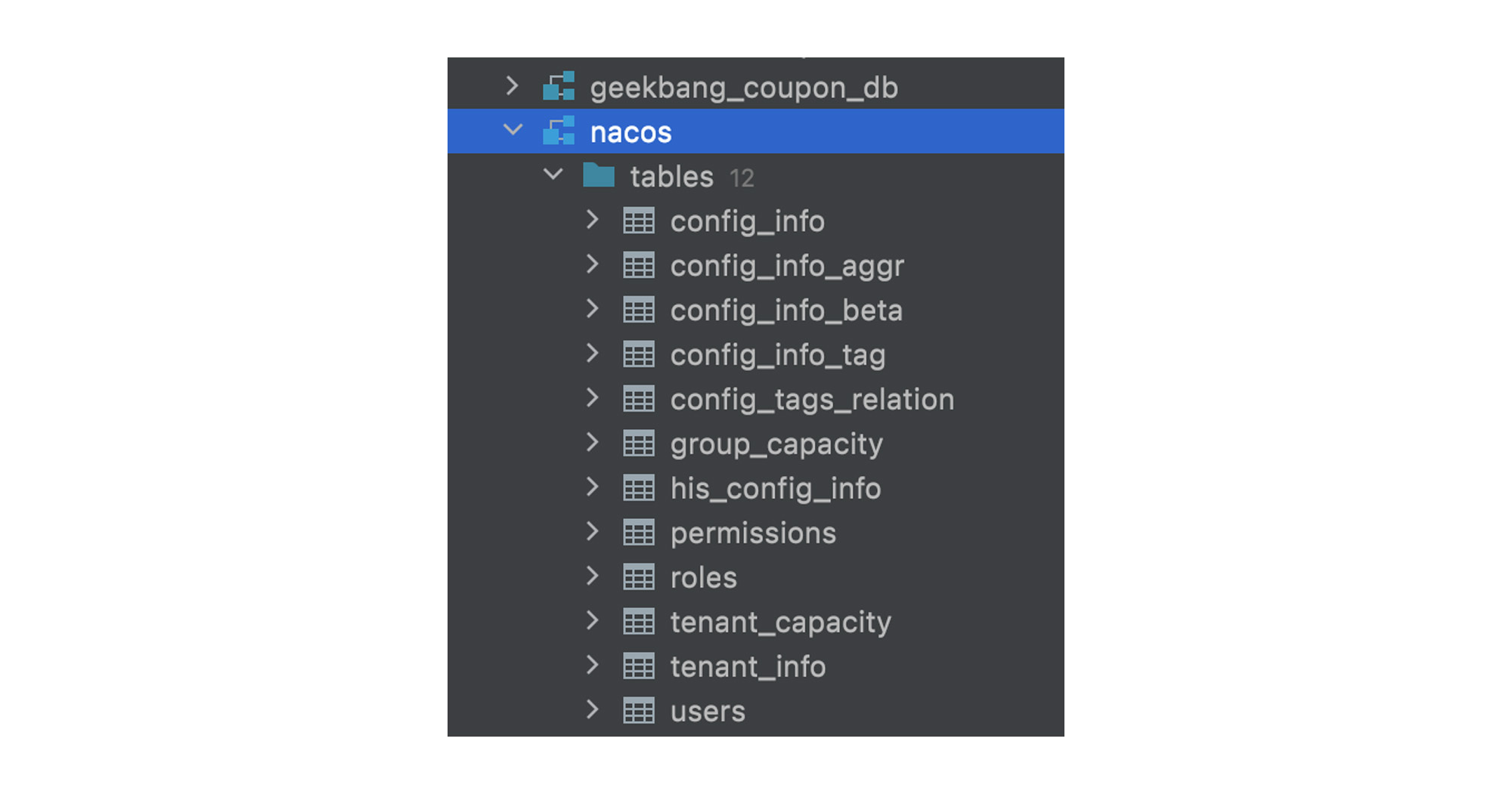 修改完数据库配置项之后,接下来我带你去MySQL中创建Nacos Server所需要用到的数据库Schema和数据库表。