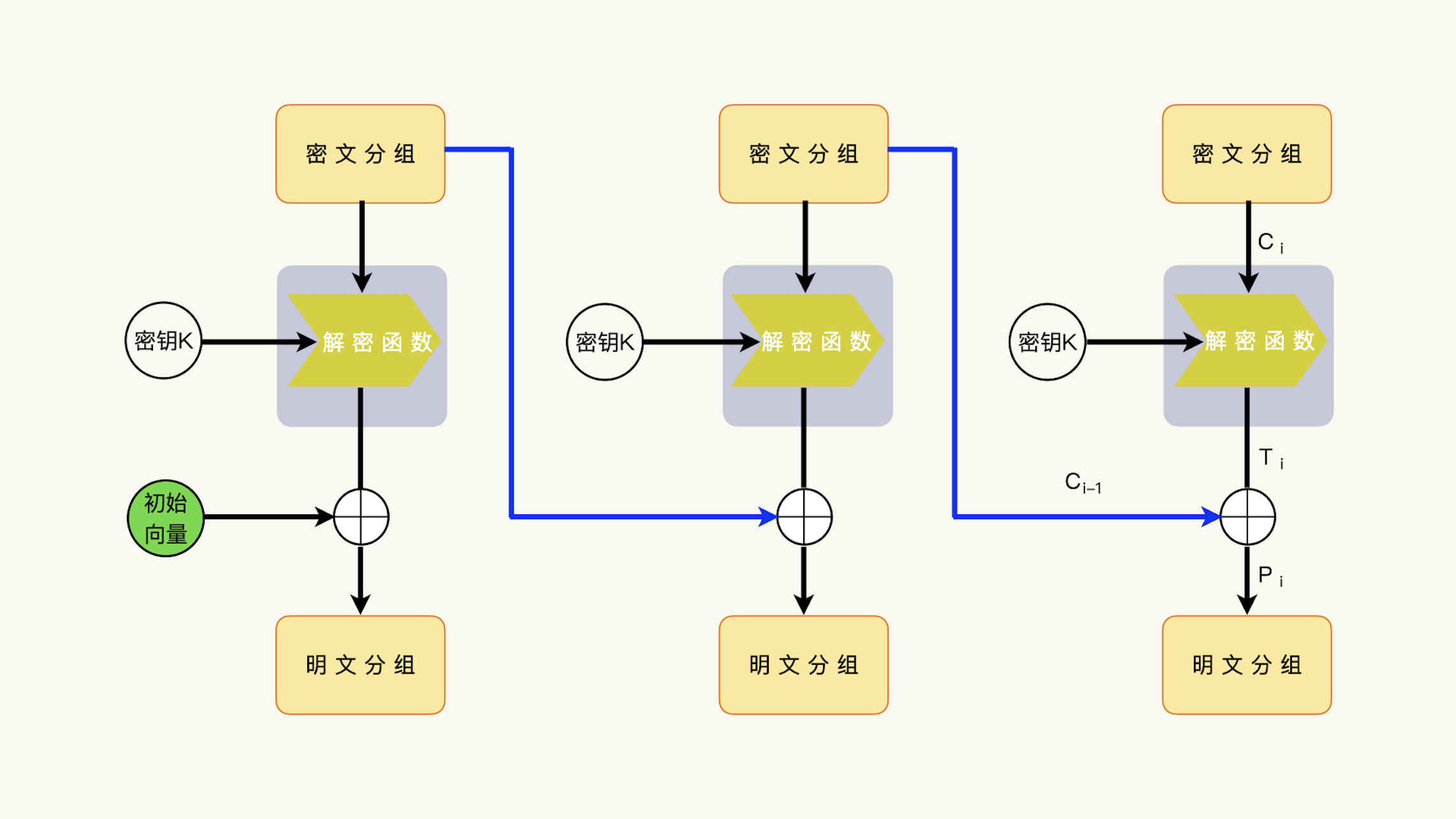 这一次的密文分组Ci和密钥K,通过解密函数的运算,可以产生一个中间结果Ti,也就是解密函数运算的中间结果Ti;然后,解密函数运算结果Ti和上一次的密文分组进行异或运算,获得明文分组Pi,Pi = Ci-1 ^ Ti。