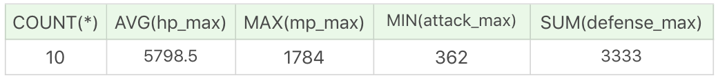 你能看到,上面的例子里,都是在一条SELECT语句中使用了一次聚集函数,实际上我们也可以在一条SELECT语句中进行多项聚集函数的查询,比如我们想知道射手(主要定位或者次要定位是射手)的英雄数、平均最大生命值、法力最大值的最大值、攻击最大值的最小值,以及这些英雄总的防御最大值等汇总数据。