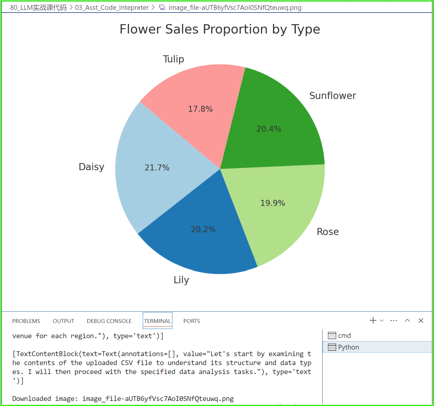 [ImageFileContentBlock(image_file=ImageFile(file_id='file-ARR9oWz1AdYwLCVeaDNsYfGk'), type='image_file'), TextContentBlock(text=Text(annotations=[], value='The line chart illustrates the daily total revenue from flower sales, showing various trends and fluctuations over time.\n\nMoving on to task #3, I will calculate the sales proportion of each flower type and visualize it using a pie chart.'), type='text')]