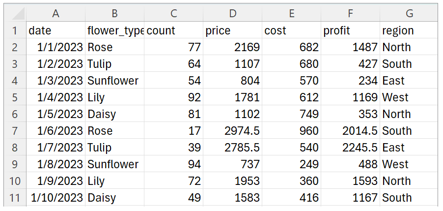 [TextContentBlock(text=Text(annotations=[], value="The dataset contains the following columns:\n- `date`: The date of sales\n- `flower`: Type of flower sold\n- `count`: The number of flowers sold\n- `price`: Total price received for the flowers sold\n- `cost`: Total cost of the flowers sold\n- `profit`: Total profit from the flower sales\n- `region`: Geographic region of the sales\n\nFrom your requests, we'll proceed with the analysis tasks:\n1. Group the data by region and calculate the total revenue for each region.\n2. Group the data by date and calculate the daily total revenue.\n3. Calculate the sales proportion of each flower type.\n4. Find the top 5 most profitable flowers based on the total profit.\n\nLet's start with task #1 and visualize the total revenue for each region."), type='text')]