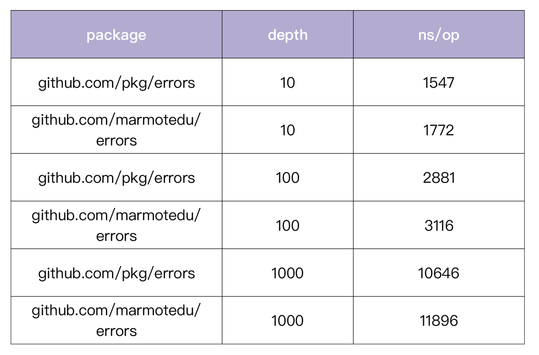 可以看到github.com/marmotedu/errors和github.com/pkg/errors包的性能基本持平。在对比性能时,重点关注ns/op,也即每次error操作耗费的纳秒数。另外,我们还需要测试不同error嵌套深度下的error操作性能,嵌套越深,性能越差。例如:在嵌套深度为10的时候, github.com/pkg/errors 包ns/op值为1547, github.com/marmotedu/errors 包ns/op值为1772。可以看到,二者性能基本保持一致。