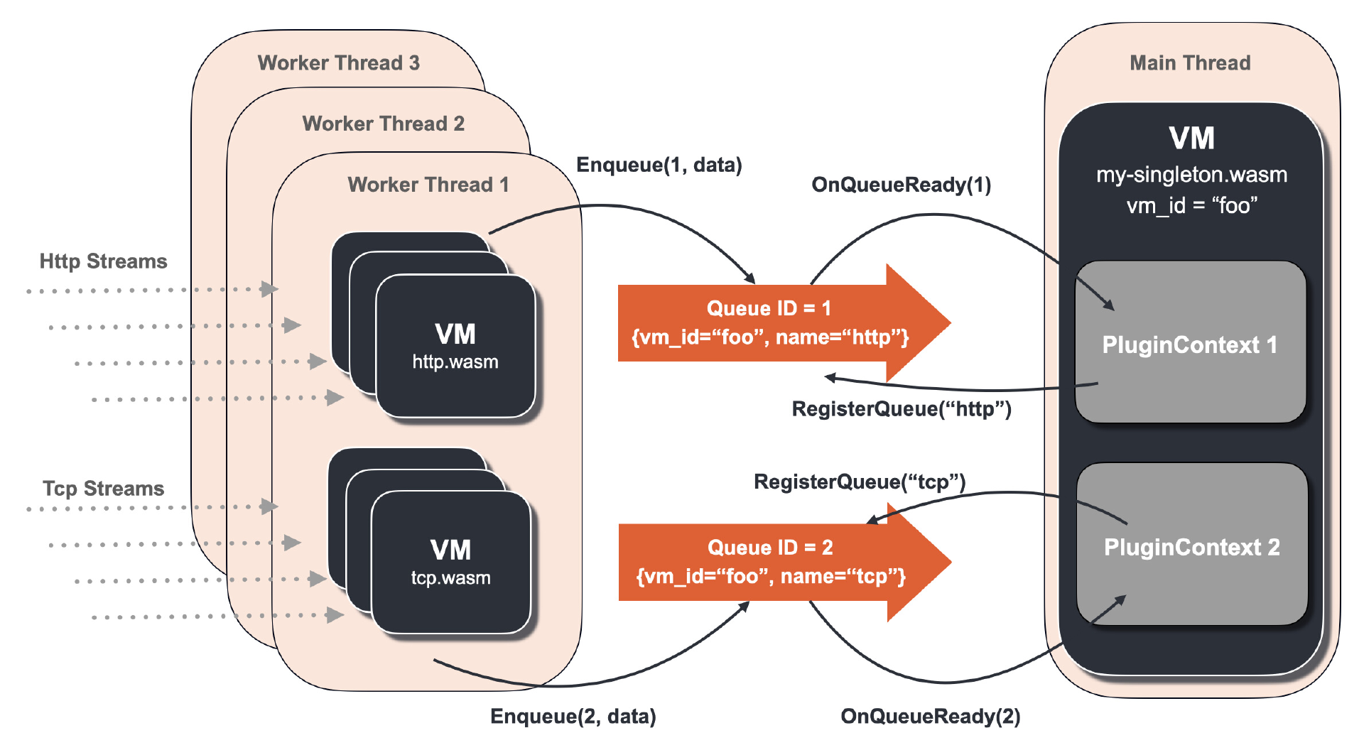 这两个调用都返回一个队列 ID,该 ID 用于 DequeueSharedQueue 和 EnqueueSharedQueue。同时当队列中入队新数据时消费者 PluginContext 中有 OnQueueReady(queueID uint32) 接口会收到通知。还强烈建议由 Envoy 的主线程上的单例 Wasm Service 创建共享队列。否则 OnQueueReady 将在工作线程上调用,这会阻塞它们处理 Http 或 Tcp 流。