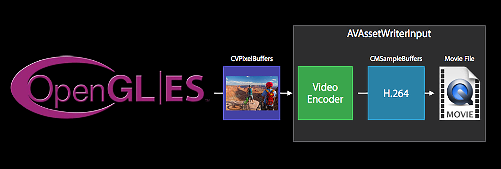 可以看到,AVAssetWriter是从OpenGL ES中拿到纹理对象,关联到CoreVideo这个framework提供的CVPixelBuffer里,然后使用VideoToolbox编码,最后把编码的H264码流写到H264文件或者封装到一个视频文件中。但如果只是封装成一个MP4文件,其实并不需要这么麻烦,我们可以利用iOS给我们封装好的API很简单地完成这种场景,如下图所示。