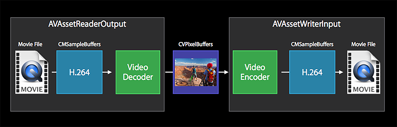 这个类可以用来拼接视频、合并音频和视频、不做任何处理的转换格式以及压缩视频等多种场景,其实它是对VideoToolbox解码、编码的一个更高层次的封装,如图所示。