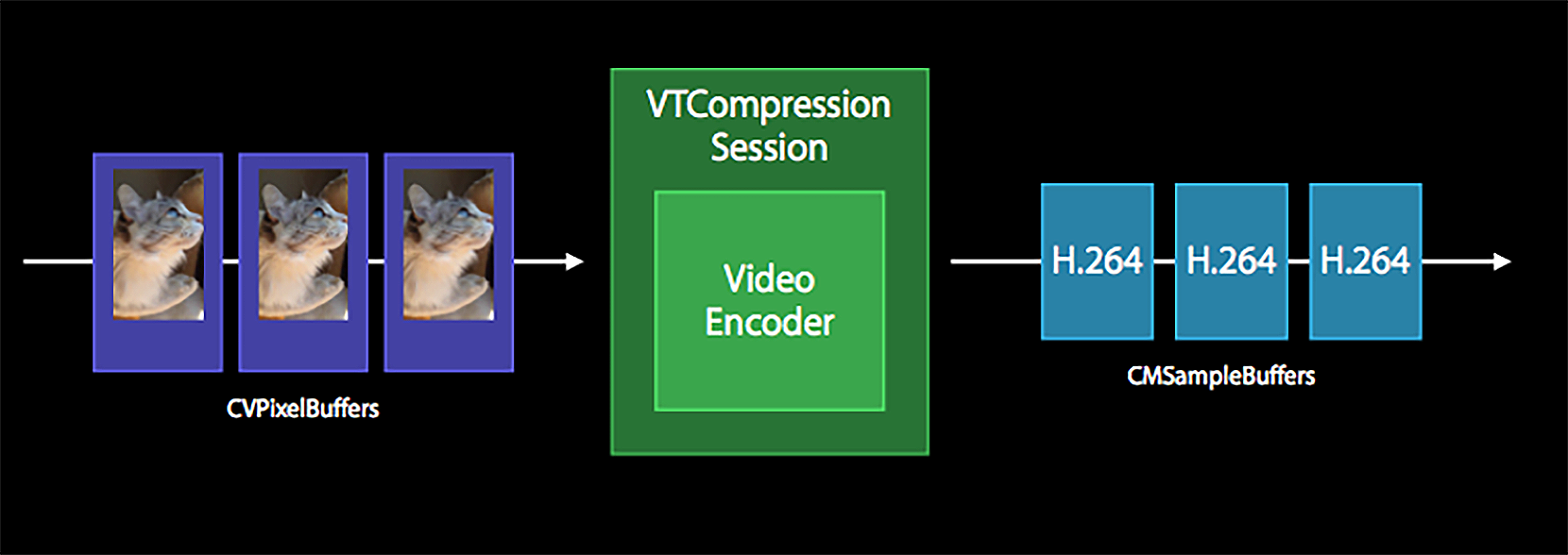 - 将CVPixelBuffer送入编码器进行编码,得到编码之后的CMSampleBuffer。