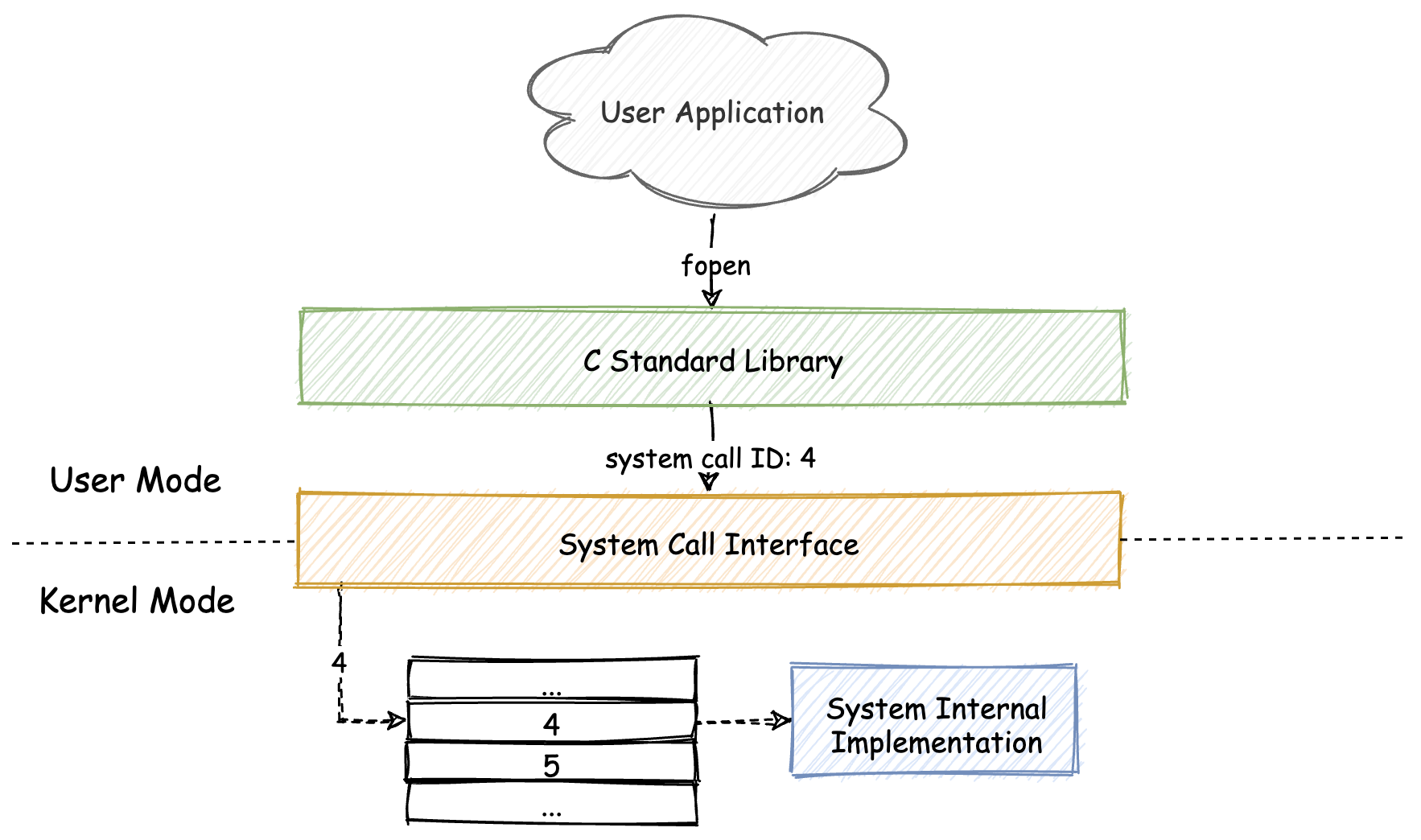 还是回到我们在上一小节中曾提到过的一个场景:“使用 C 标准库中的 fopen 函数,来打开一个计算机本地文件”。请试想,当我们在调用这个 fopen 函数打开某个文件时,实际上发生了什么?fopen 函数是如何访问操作系统的文件资源的呢?带着这两个问题,我们一步步来看。