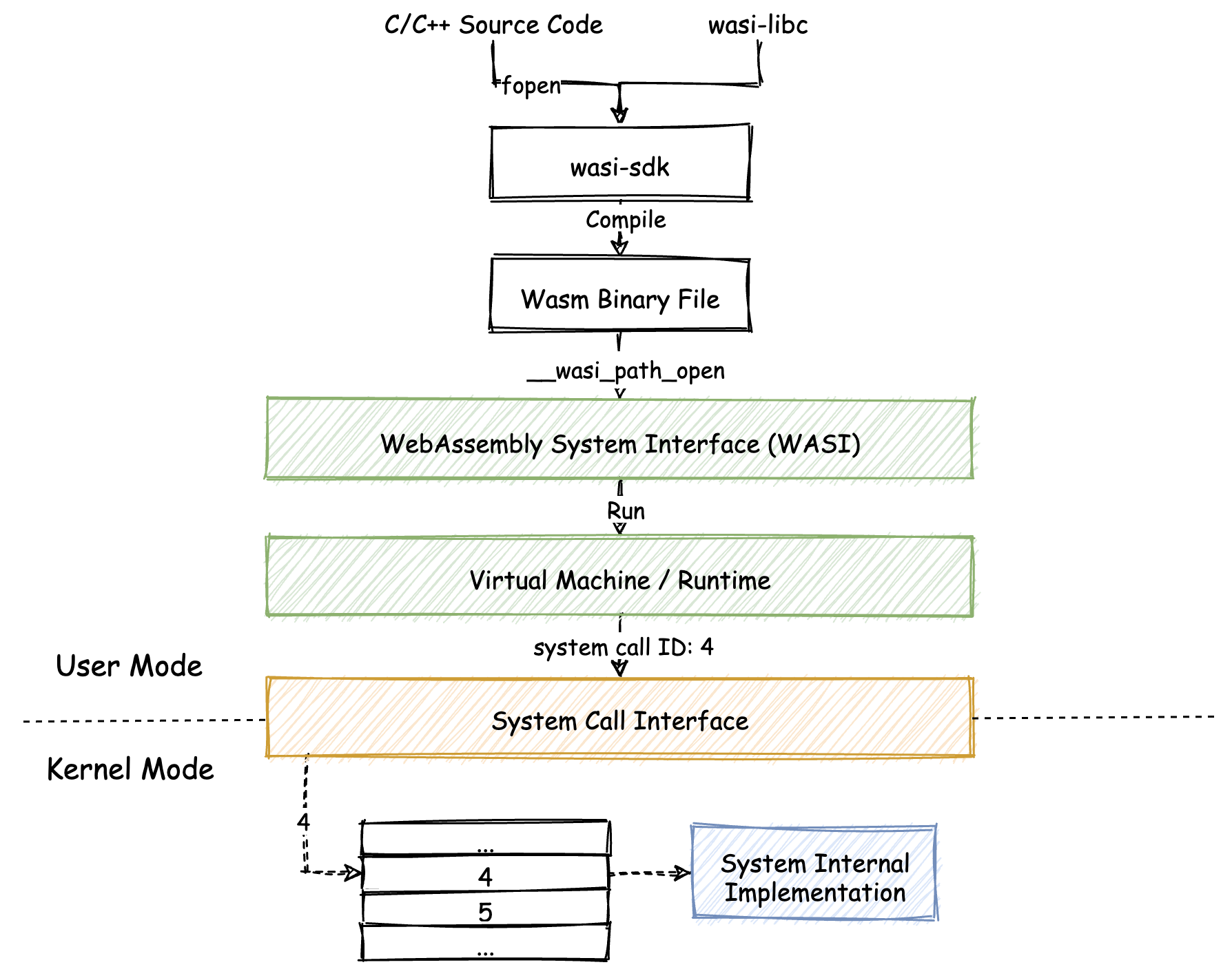 但是问题来了。我们知道,在如 musl 这类 C 标准库的实现中,类似 fopen 这样的函数,最后会被编译为对某个特定平台(IA32、X86-64 等)系统调用的调用过程。这对于 Wasm 来说,会使自己丧失“天生自带”的可移植性。
