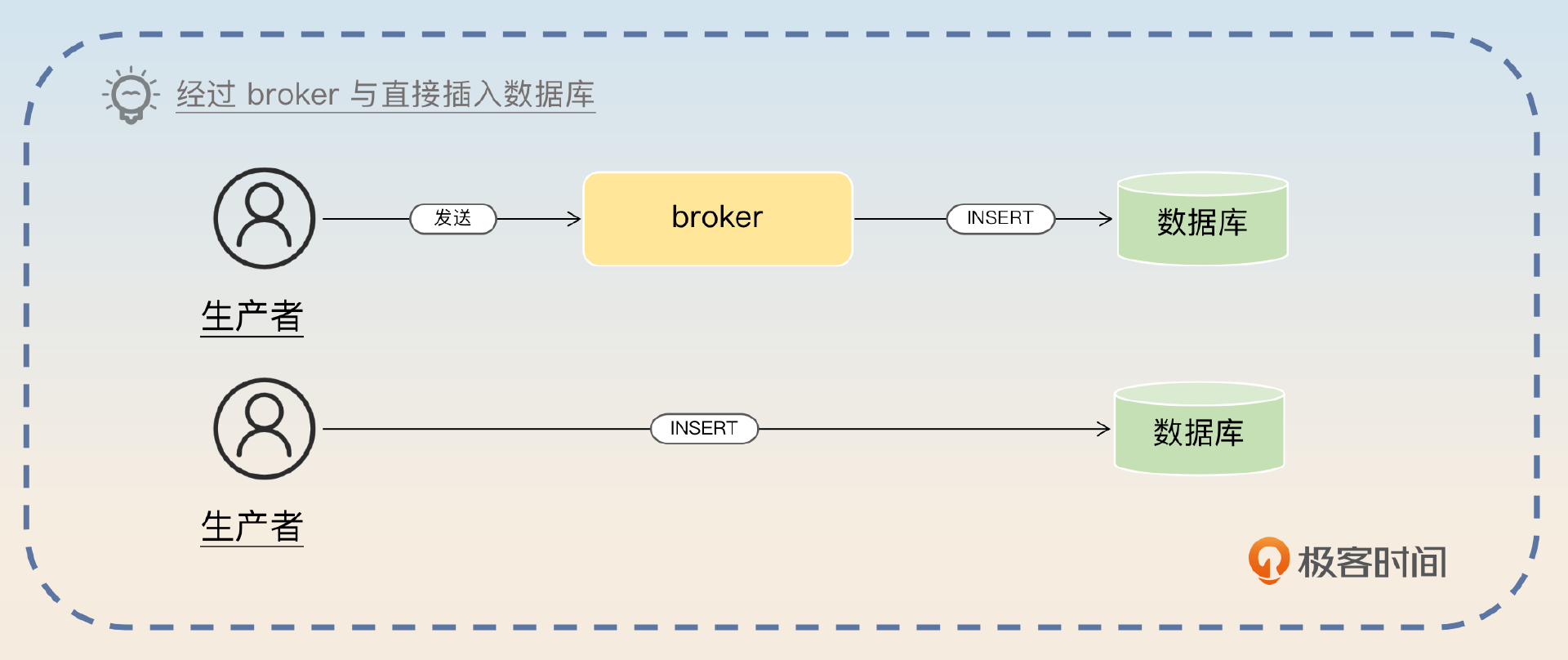 在 MySQL 的实现里面,消息最终是存储在数据库里面,你既可以通过 broker 来访问这个数据库,也可以让生产者直接访问这个数据库。后者,你也可以认为生产者和 broker 就是一体的。