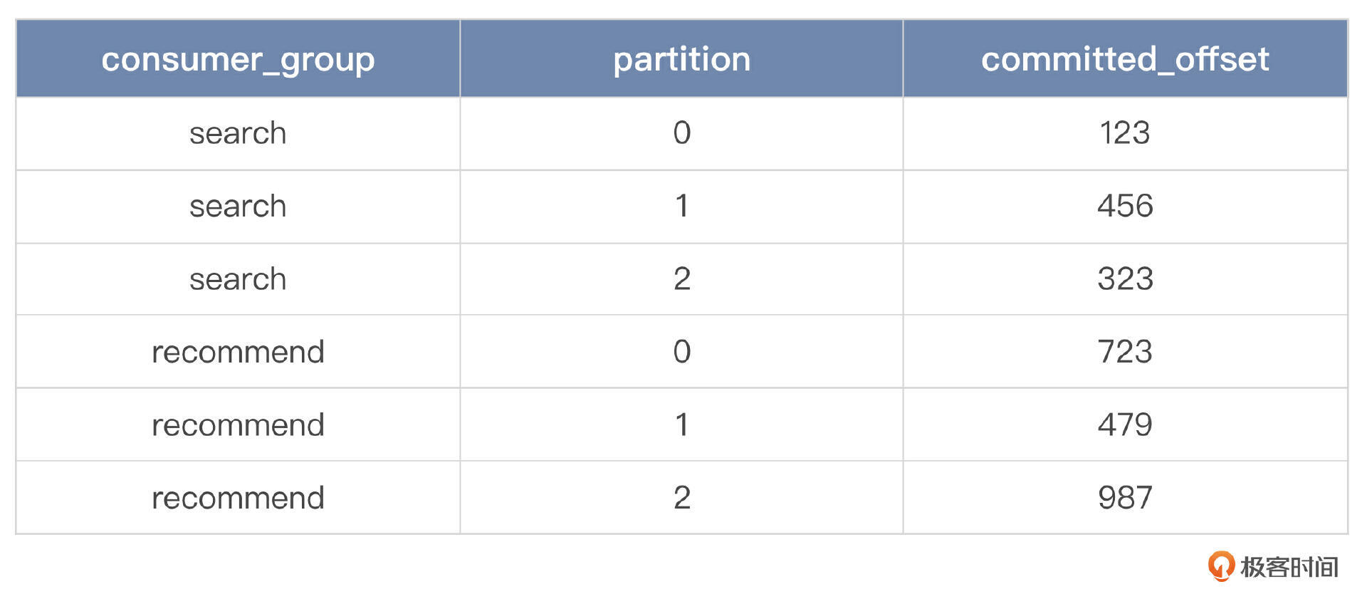 这张表的设计也很简单,主要包含三列:消费者组的名字、分区、已消费偏移量。假如说 create_order 这个 topic 有搜索和推荐两个业务方消费消息,那么 create_order_consumers 这张表的数据就类似于下面这样。