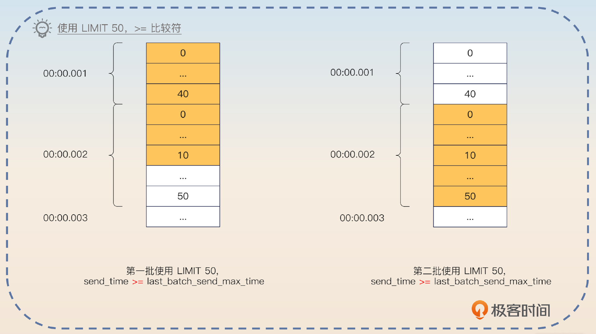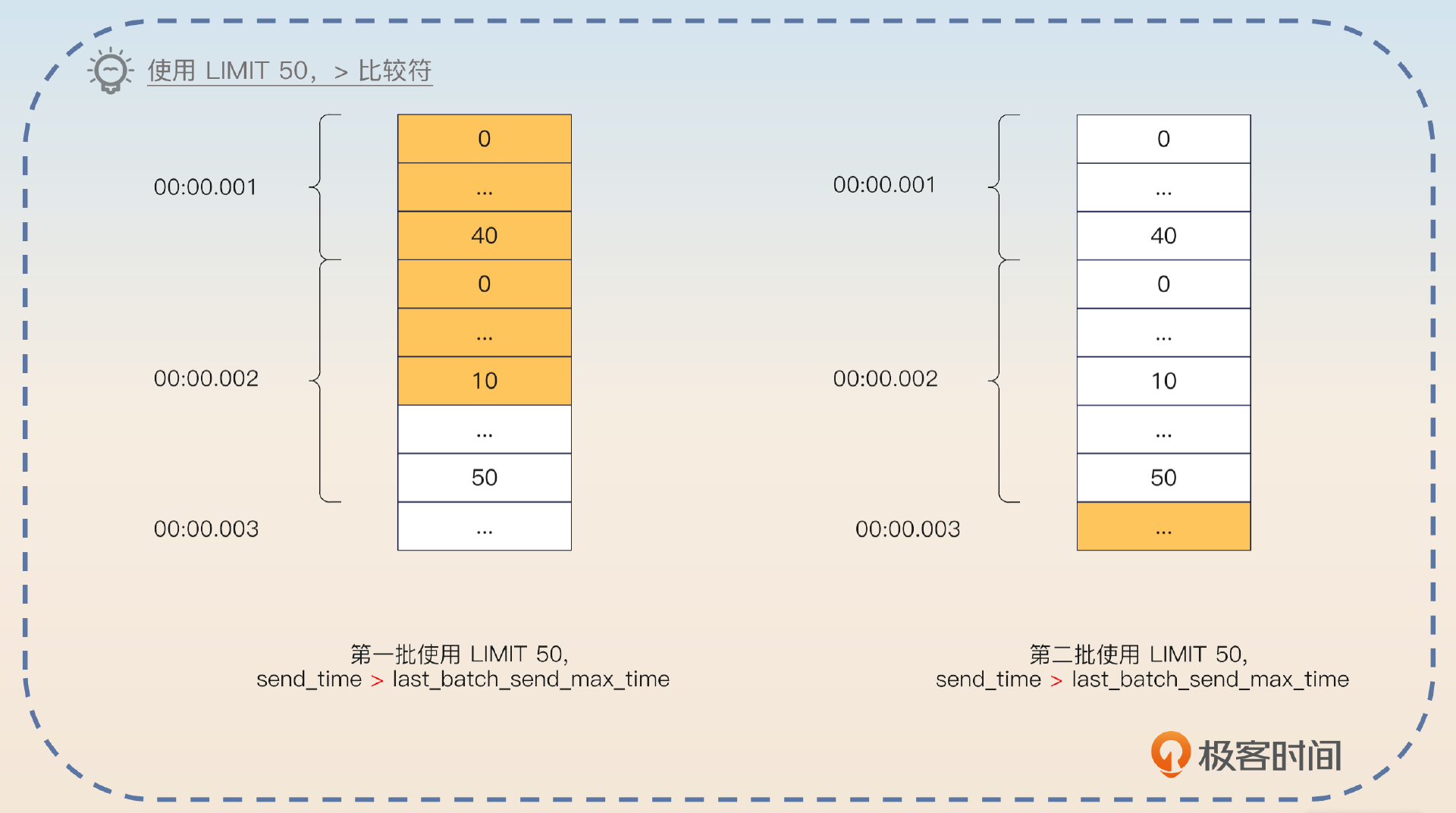 举个例子来说,数据库里面有 40 条消息是在 00:00.001 时刻发送,50 条是在 00:00.002 时刻发送。如果你在 SELECT 语句里面加上 LIMIT 50,那么你就会拿到 40 条 00:00.001 发送的消息,10 条 00:00.002 发送的消息。下一次执行的时候, WHERE send_time > 00:00.002 就会把剩下的 40 条 00:00.002 发送的消息全部跳过。