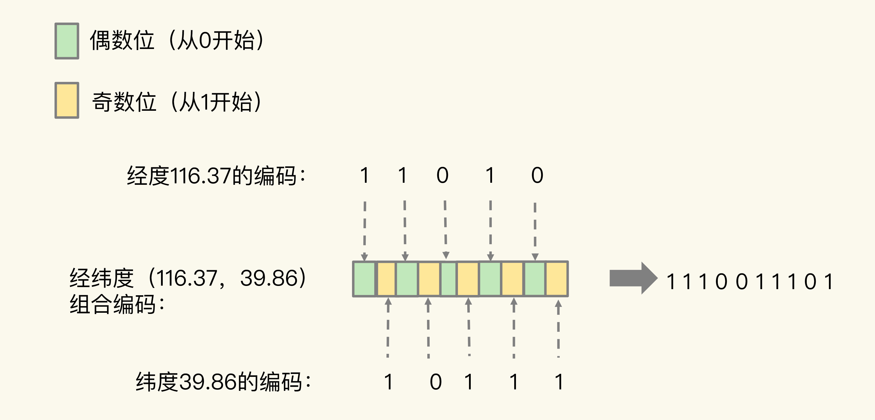 我们刚刚计算的经纬度(116.37,39.86)的各自编码值是11010和10111,组合之后,第0位是经度的第0位1,第1位是纬度的第0位1,第2位是经度的第1位1,第3位是纬度的第1位0,以此类推,就能得到最终编码值1110011101,如下图所示: