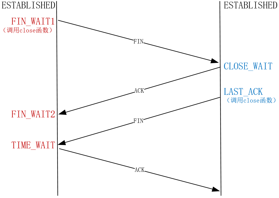 当主动方关闭连接时,会发送FIN报文,此时主动方的连接状态由ESTABLISHED变为FIN_WAIT1。当被动方收到FIN报文后,内核自动回复ACK报文,连接状态由ESTABLISHED变为CLOSE_WAIT,顾名思义,它在等待进程调用close函数关闭连接。当主动方接收到这个ACK报文后,连接状态由FIN_WAIT1变为FIN_WAIT2,主动方的发送通道就关闭了。