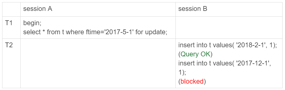 所以,session B要写入一行ftime是2018-2-1的时候是可以成功的,而要写入2017-12-1这个记录,就要等session A的间隙锁。
