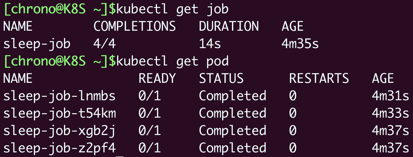 等到4个Pod都运行完毕,我们再用 kubectl get 来看看Job和Pod的状态: