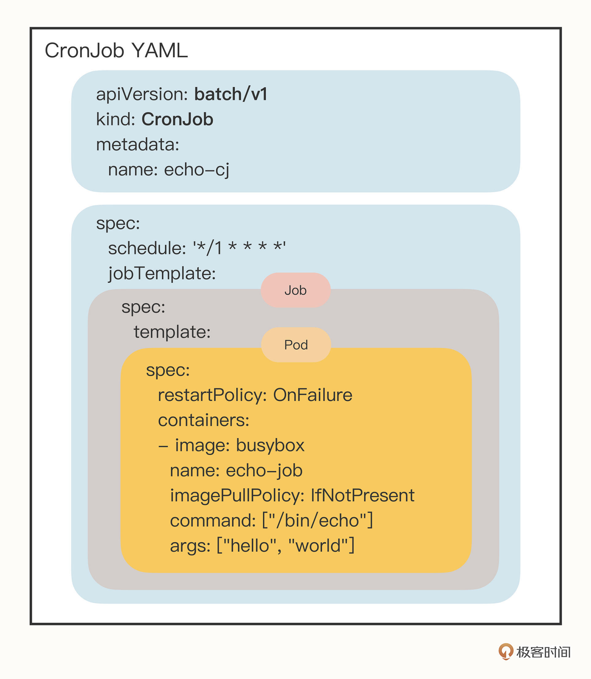 为了辅助你理解,我把Job对象重新组织了一下,用不同的颜色来区分字段,这样你就能够很容易看出来,其实这个“echo-job”里并没有太多额外的功能,只是把Pod做了个简单的包装: