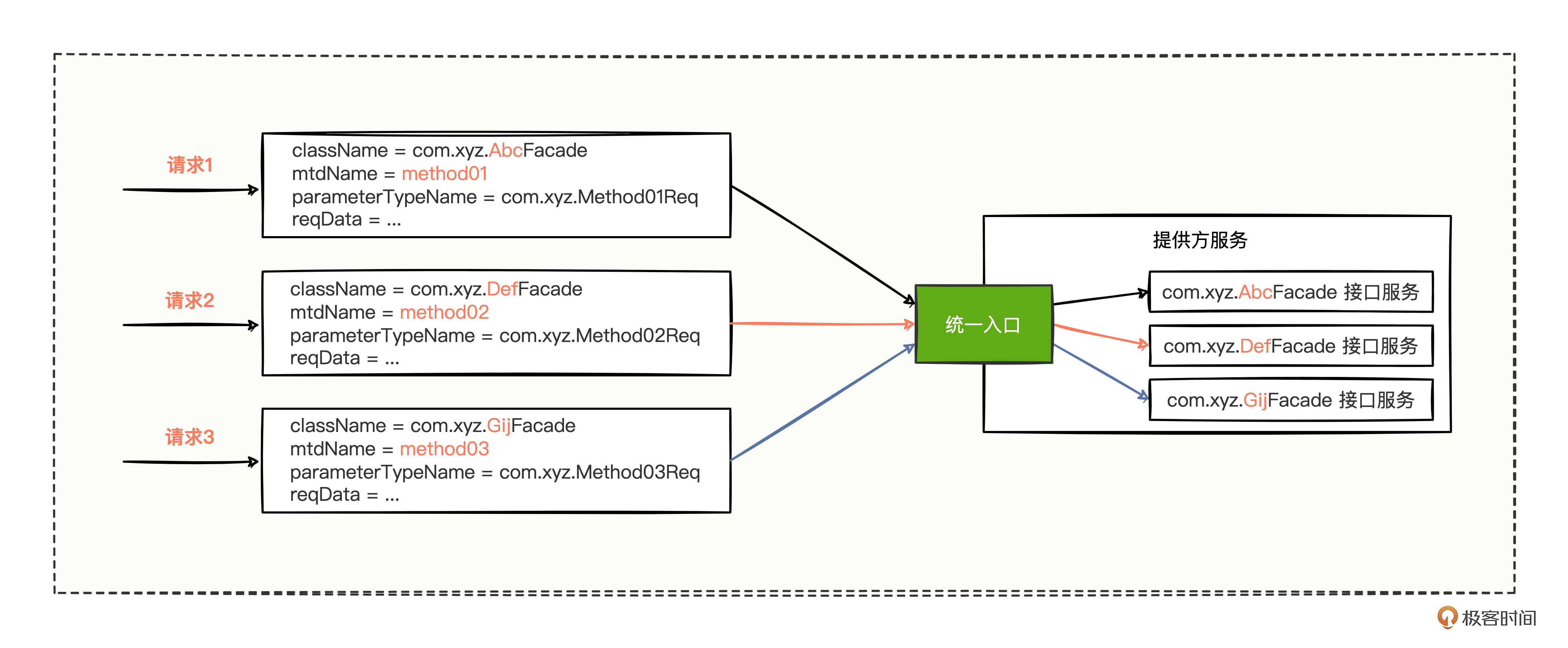 总结 今天,我们从在提供方服务设计统一入口来接收各种请求的案例开始,进行分析与改造。