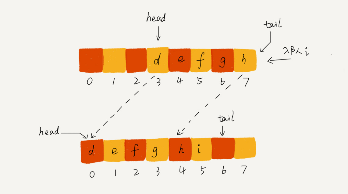 从代码中我们看到,当队列的tail指针移动到数组的最右边后,如果有新的数据入队,我们可以将head到tail之间的数据,整体搬移到数组中0到tail-head的位置。
