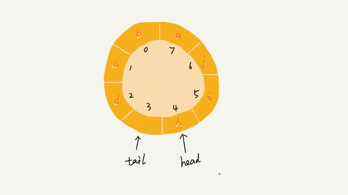 你可以结合下面这张图来理解。当a、b、c、d依次入队之后,队列中的head指针指向下标为0的位置,tail指针指向下标为4的位置。