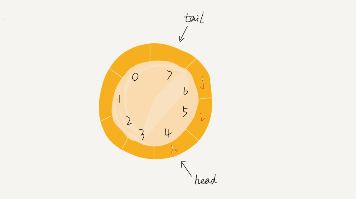 通过这样的方法,我们成功避免了数据搬移操作。看起来不难理解,但是循环队列的代码实现难度要比前面讲的非循环队列难多了。要想写出没有bug的循环队列的实现代码,我个人觉得,最关键的是,确定好队空和队满的判定条件。