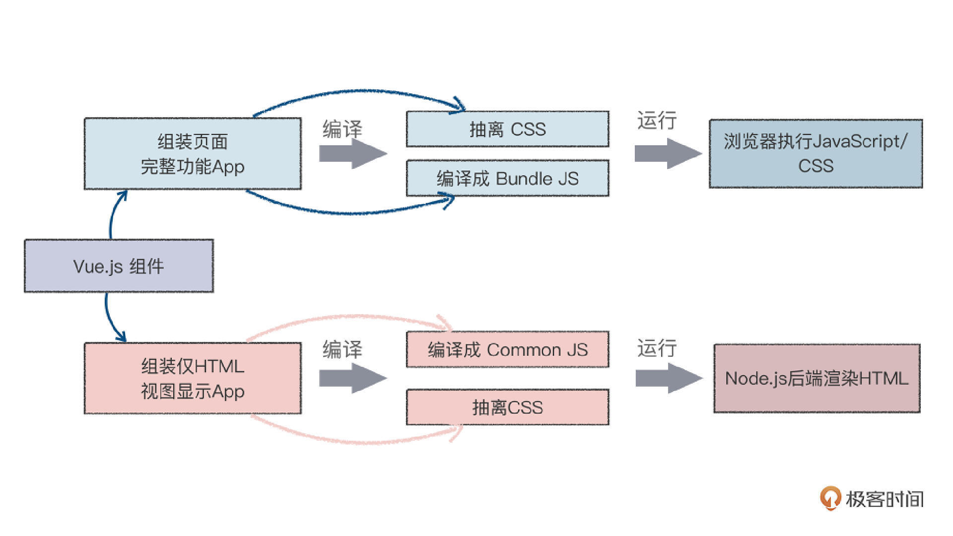 之前,我们课上所有Vue.js的代码,都是在浏览器里运行的。在浏览器里,编译后的Vue.js源码是纯粹的JavaScript代码,可以直接执行,并渲染出对应的视图和交互效果。