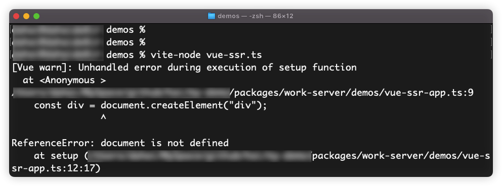 上述代码中存在浏览器操作DOM的JavaScript API,在Node.js环境里是不存在的,如果在Node.js执行SSR时候,会报错: