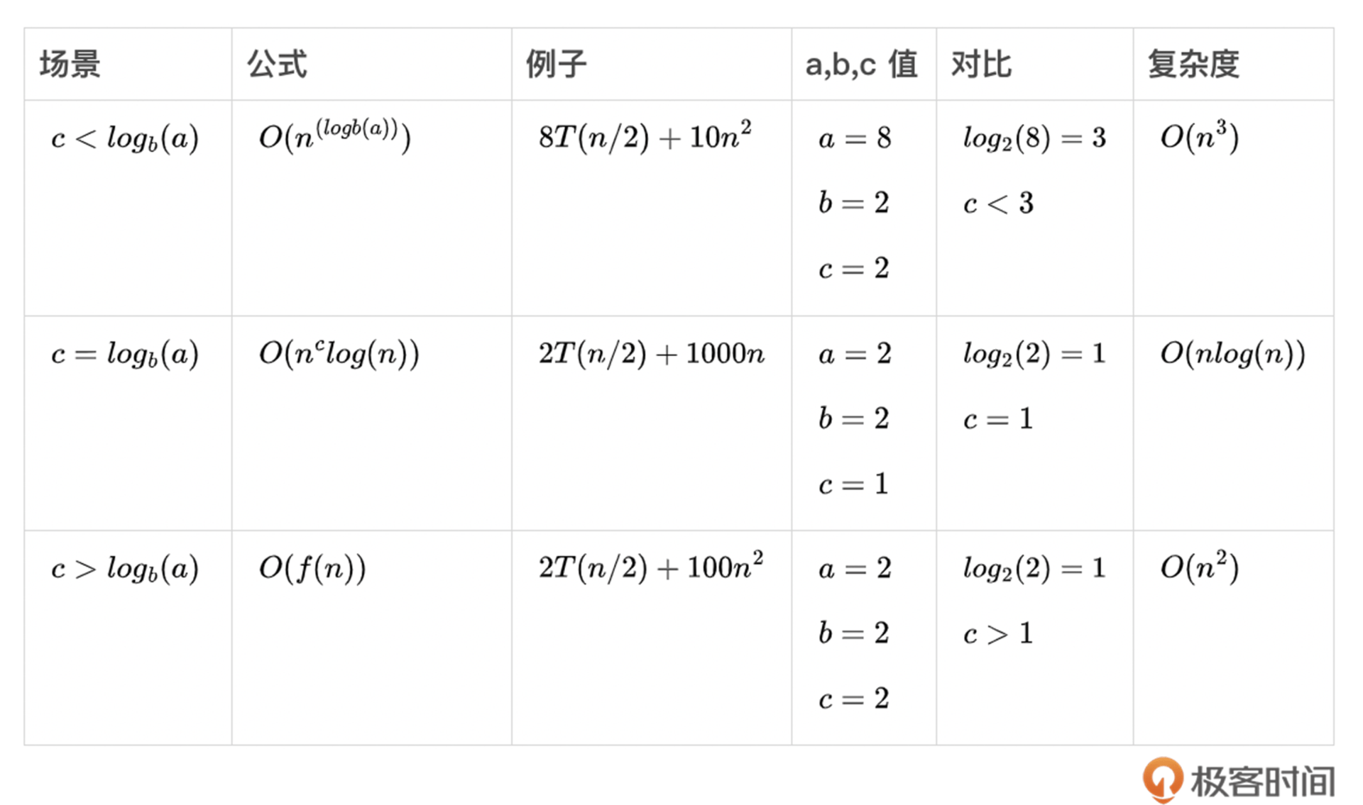 在这里面,n是问题规模的大小,a是子问题个数,n/b是每个子问题的大小,$O(n^{c})$是将原问题分解和将子问题的解合并的时间。
