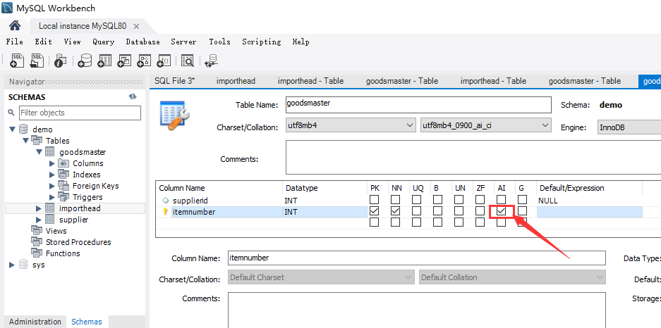 举个例子,我们通过Workbench把数据表demo.goodsmaster中的字段itemnumber,定义为满足自增约束,如下图所示: