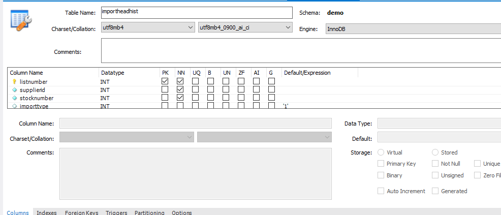 | CREATE TABLE demo.importhead ( listnumber INT, supplierid INT, stocknumber INT, --我们在字段importype定义为INT类型的后面,按照MySQL创建表的语法,加了默认值1。 importtype INT DEFAULT 1, quantity DECIMAL(10,3), importvalue DECIMAL(10,2), recorder INT, recordingdate DATETIME );