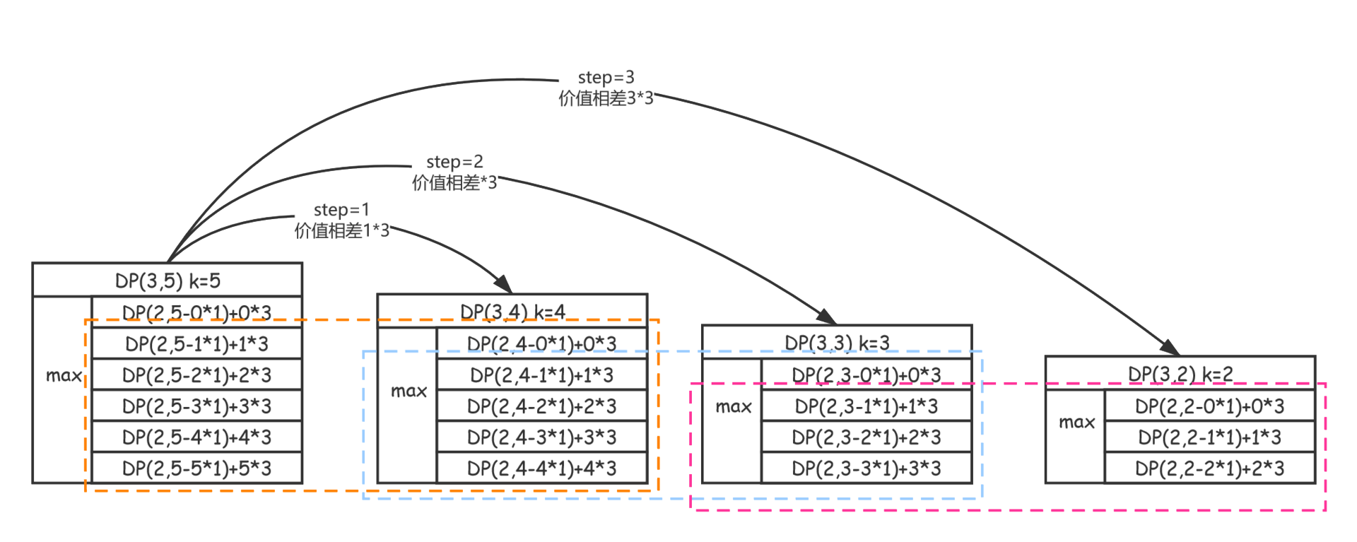 然后我们再看 $DP(3, 5)$ 和 $DP(3, 3)$ 两个子问题,前四步依赖的子问题是完全相同的(都相差2个物品的价值),因此这两个子问题之间(状态)只相差了两次循环步骤,然后再加上2个物品的价值。以此类推,原本方程中的 $k$ 次循环,其实是在其它子问题中被重复计算了。