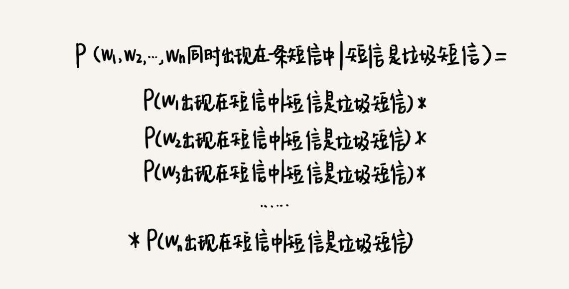 基于这条独立事件发生概率的计算公式,我们可以把P(W1,W2,W3,…,Wn同时出现在一条短信中 | 短信是垃圾短信)分解为下面这个公式: