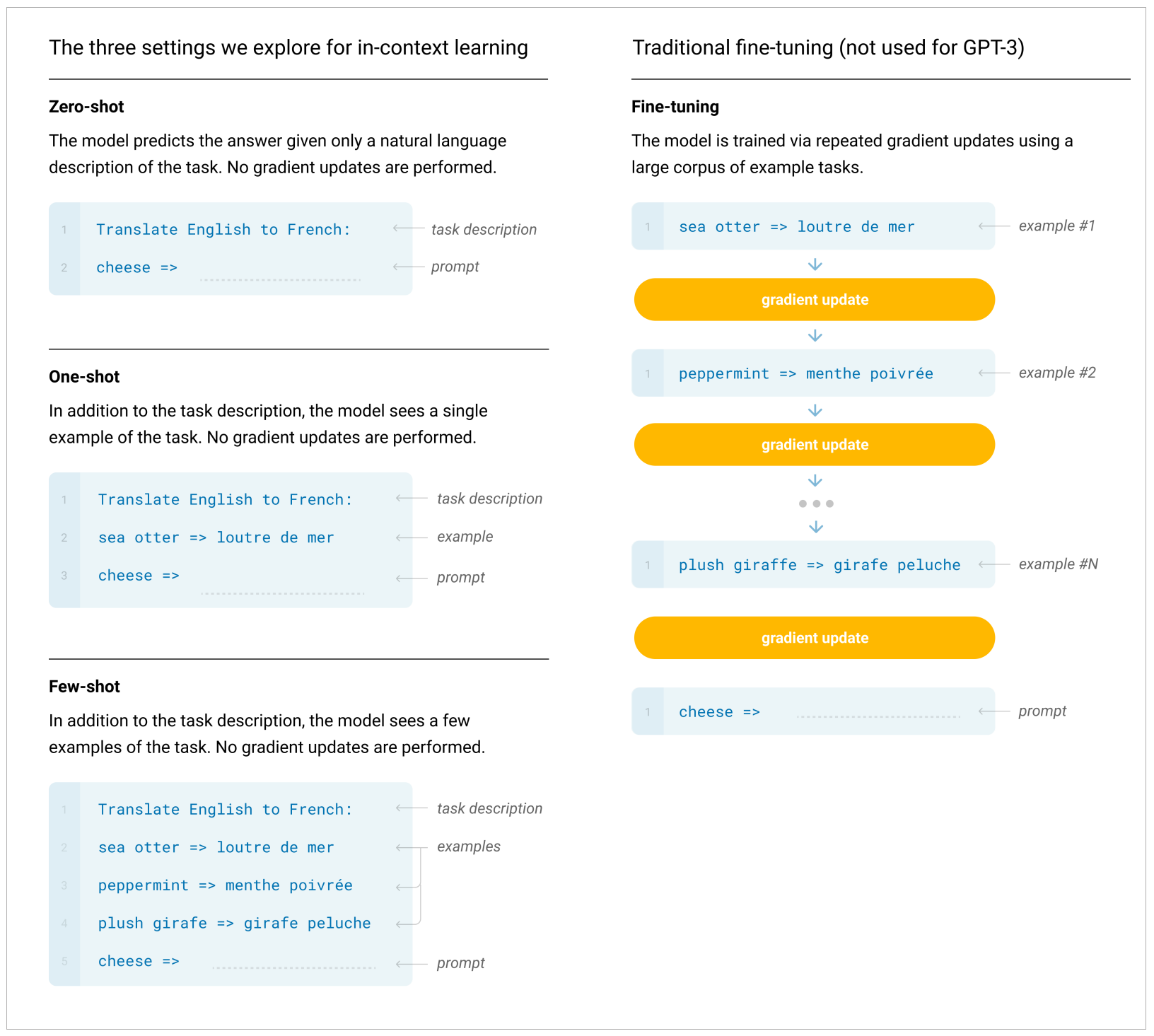 - 在Few-Shot学习设置中,模型会被给予几个示例,以帮助模型理解任务,并生成正确的响应。