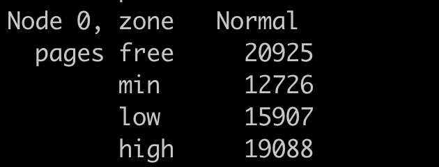 在这里zone是Linux划分物理内存的一个区域,里面有3个水位线(water mark),水位线可以用来警示空闲内存的紧张程度。