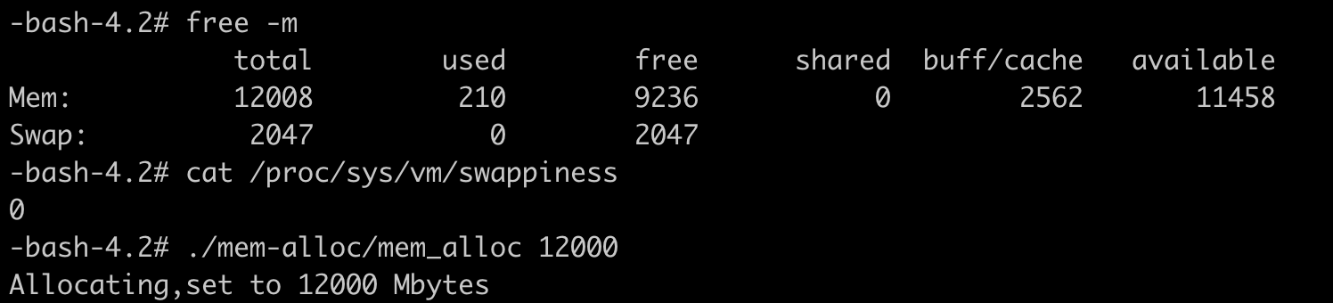 这里我们可以再做个试验来验证一下,先运行 echo 0 > /proc/sys/vm/swappiness 命令把swappiness设置为0, 然后用我们之前例子里的mem_alloc程序来申请内存。