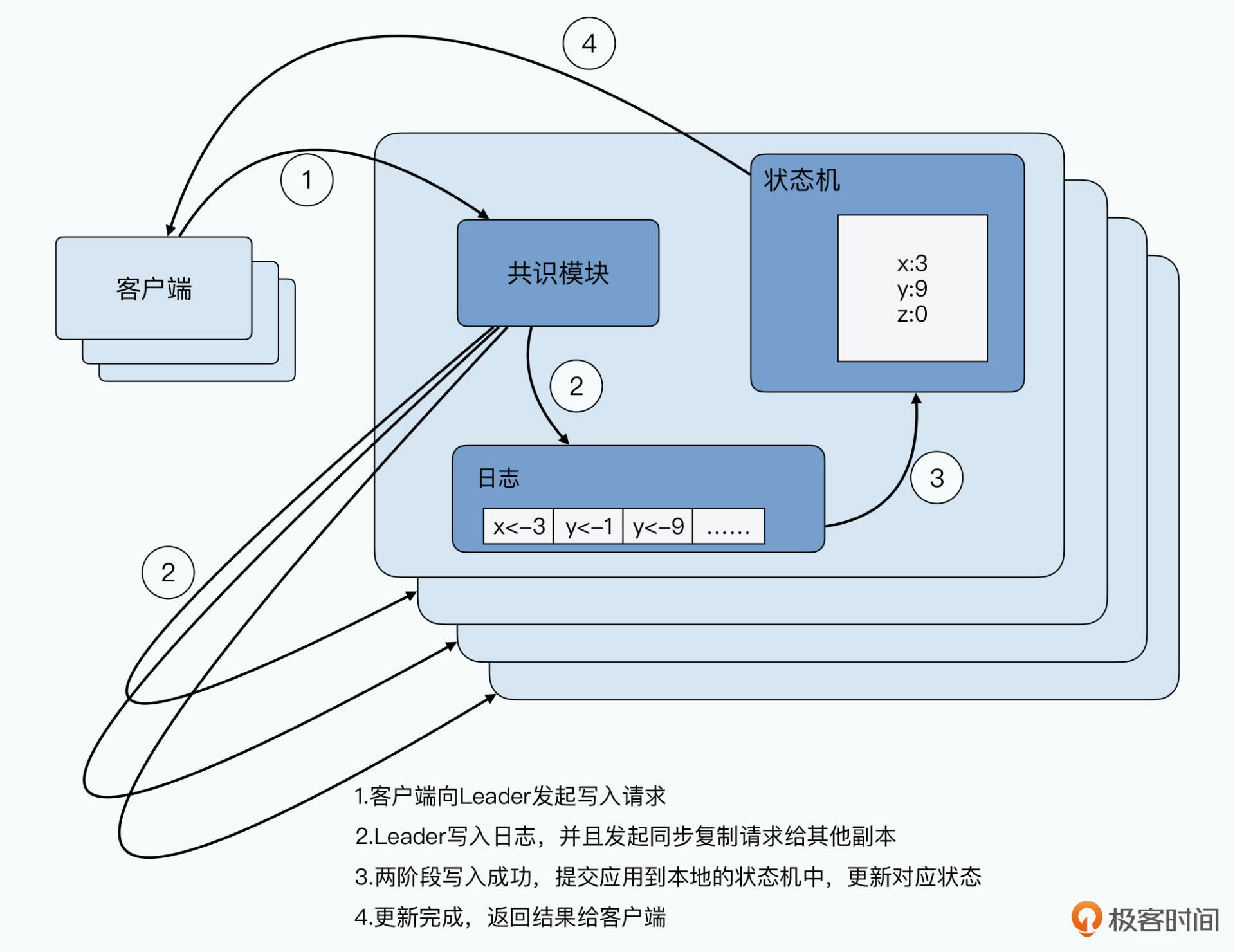 我们可以把一个数据库的写入操作,看成是一系列的顺序操作日志,也就是把对于数据库的写入,变成了一个状态机。而对于这个状态机的更新,我们需要保障高可用性和容错能力。这个需要我们对于某一个服务器上的日志追加写入,能够做到同步复制到多个服务器上。