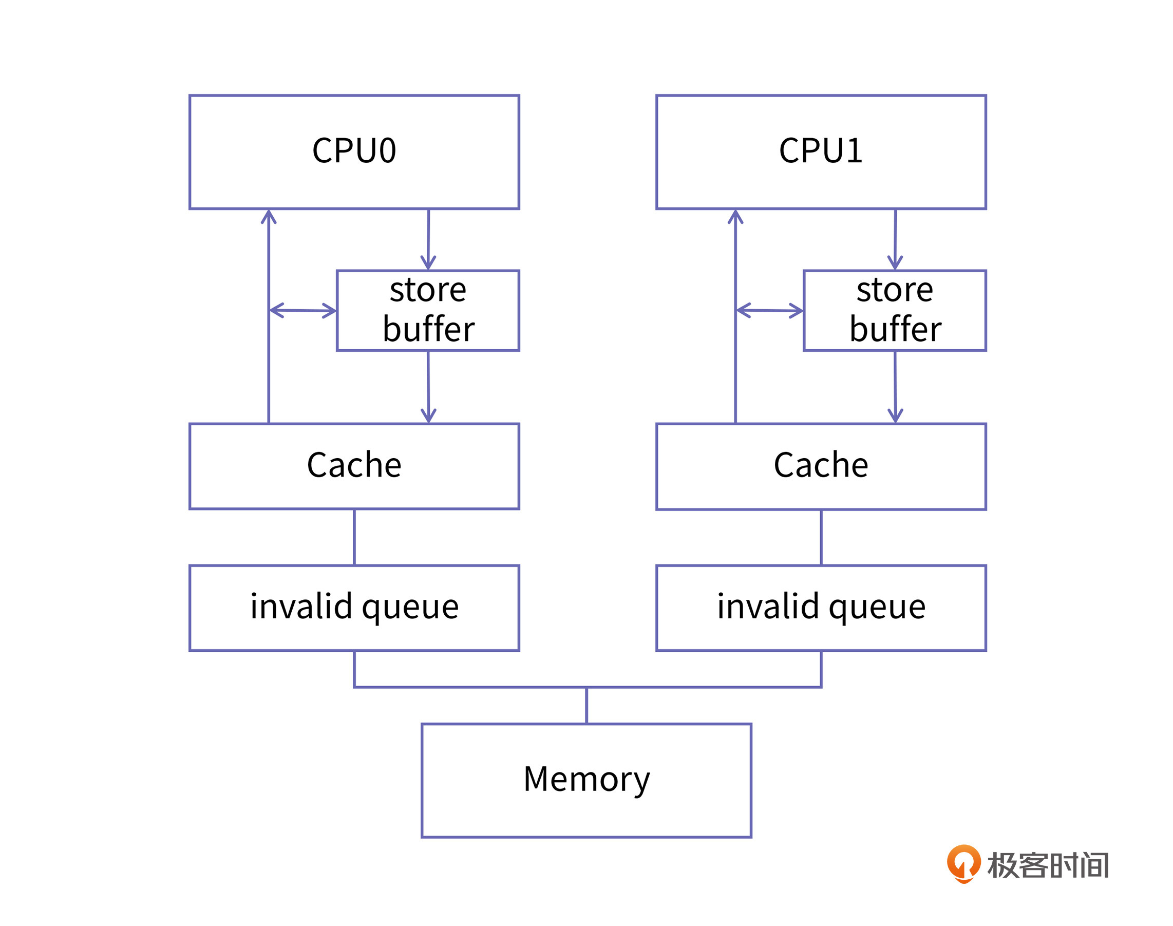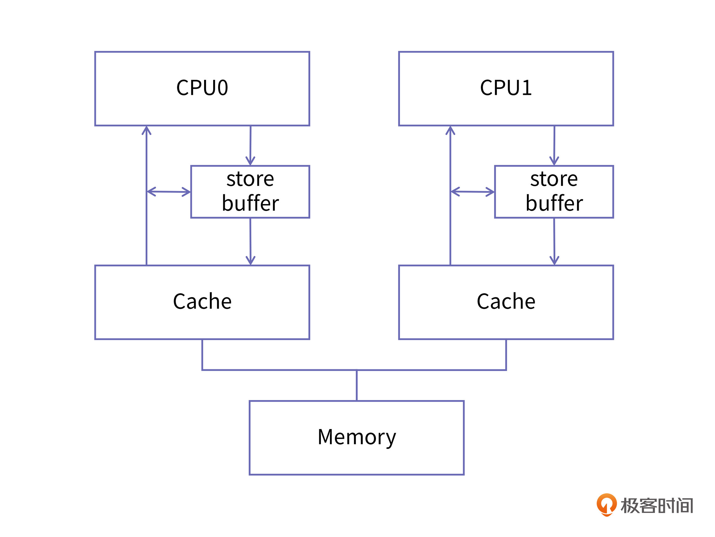 为了让你更好理解核间同步的问题,我们现在来举个例子。我们使用两个CPU,分别叫做CPU0和CPU1,其中CPU0负责写数据,而CPU1负责读数据,我们看看在增加了store buffer这个结构以后,它们在进行核间同步时会遇到什么问题。