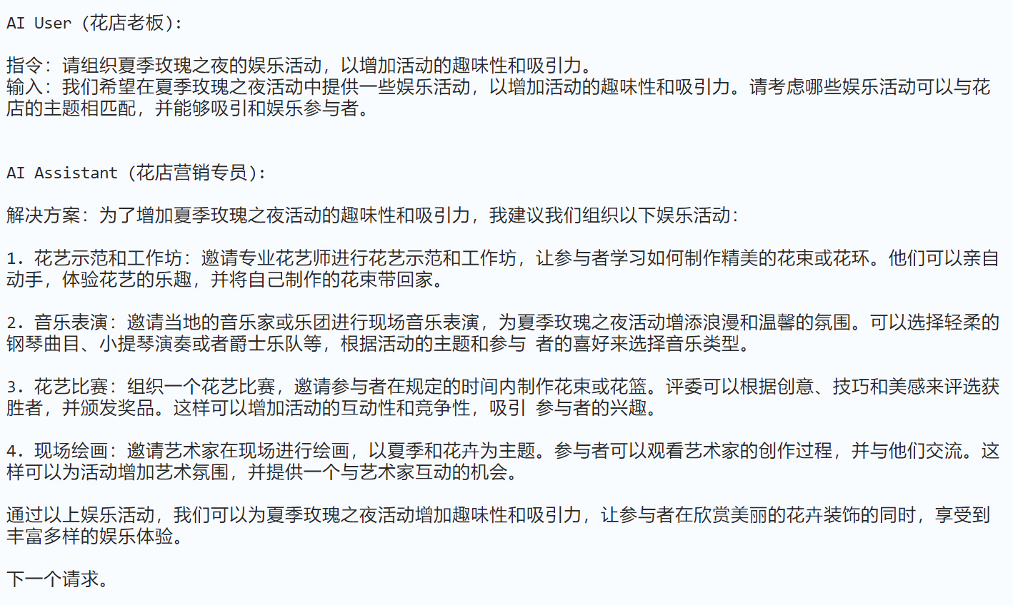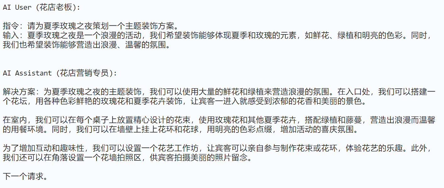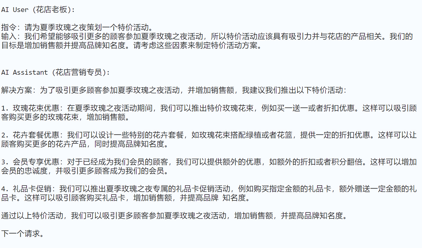 assistant_role_name = "花店营销专员":这是定义助手的角色。在此设定中,助手被视为一名花店营销专员,主要职责是为花店老板(即用户)提供关于营销活动的建议和策略。user_role_name = "花店老板":这是定义用户的角色。用户在这里是花店的老板,他们可能会向营销专员(即助手)提出关于花店推广活动的需求或询问,然后由营销专员来答复和提供建议。