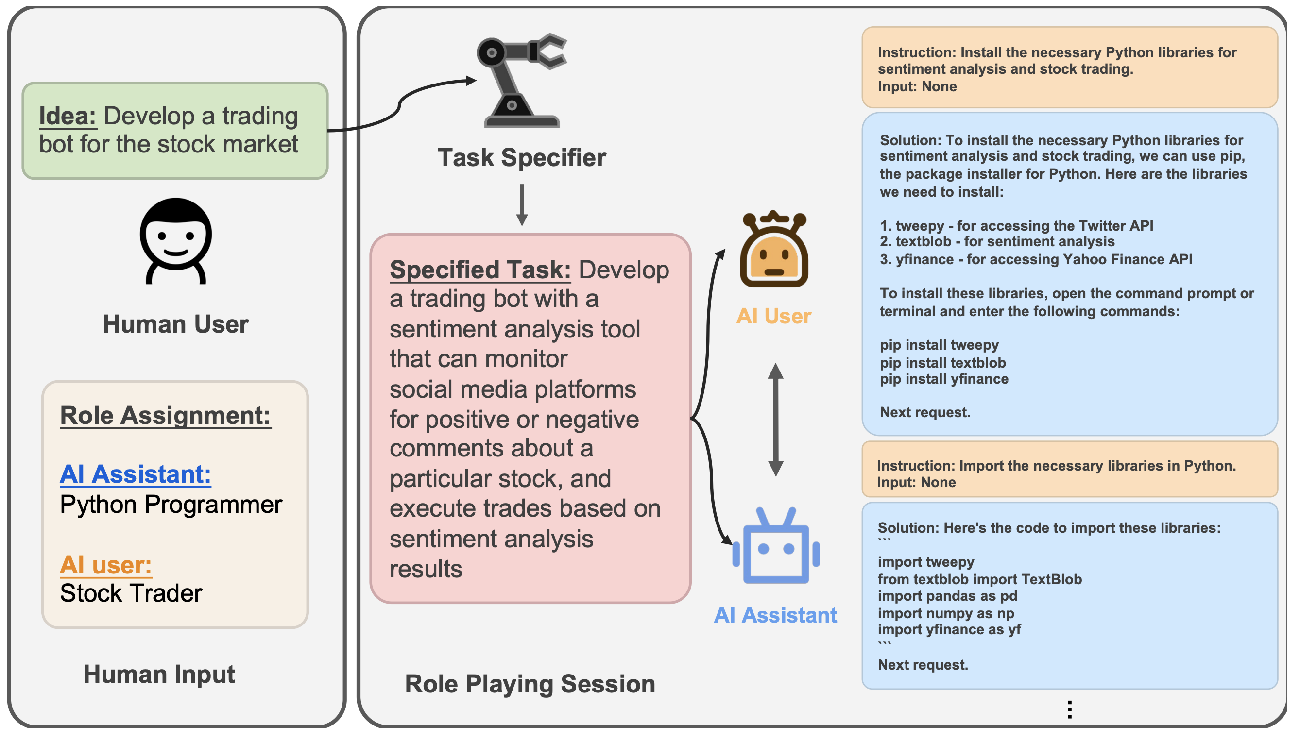 其中,AI 用户是任务规划者,负责向 AI 助手发出以完成任务为导向的指令。另一方面,AI 助手是任务执行者,被设计为遵循 AI 用户指令并提供具体的解决方案,在这里他将给出设计股票交易系统的具体Python代码。
