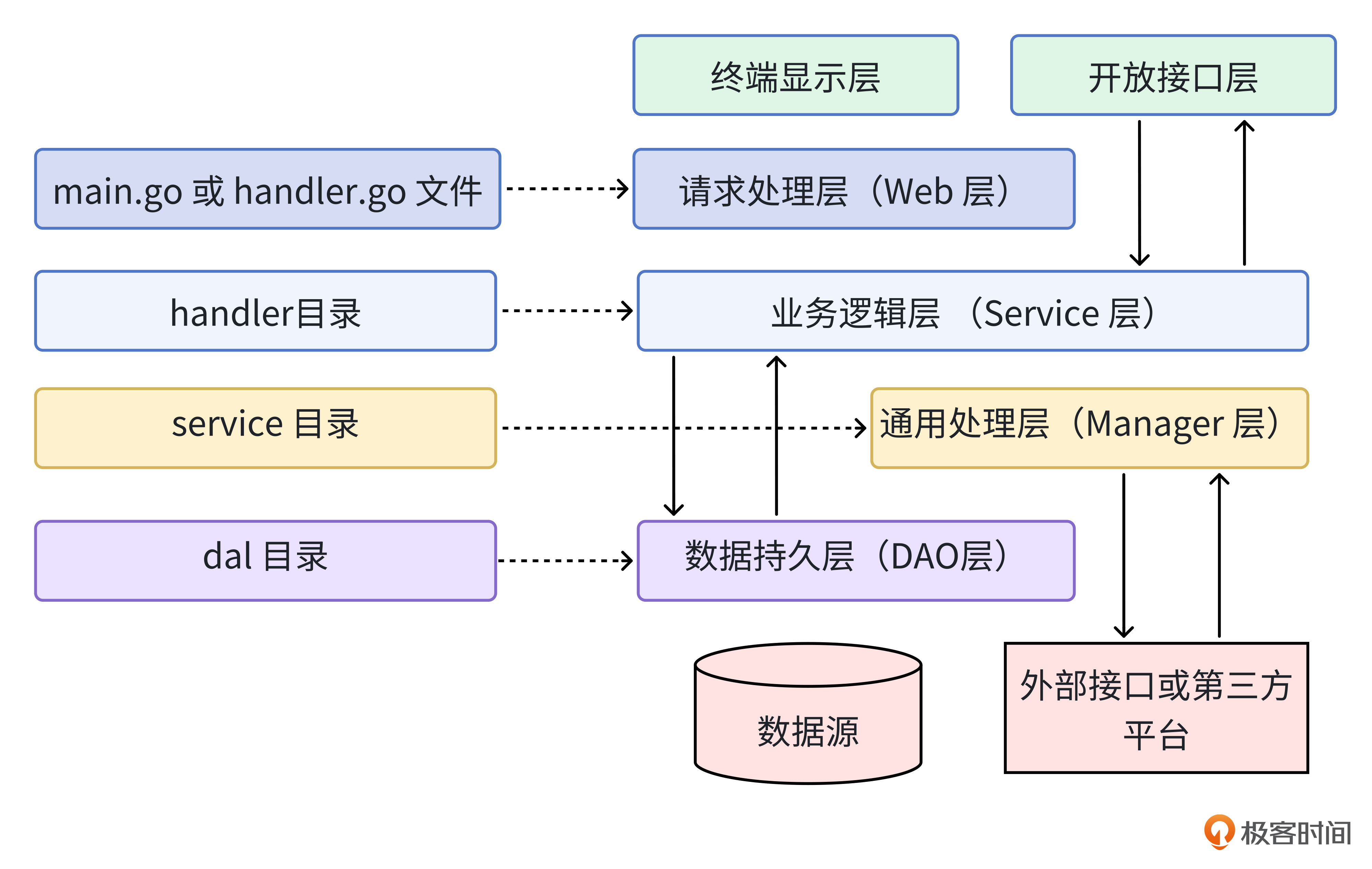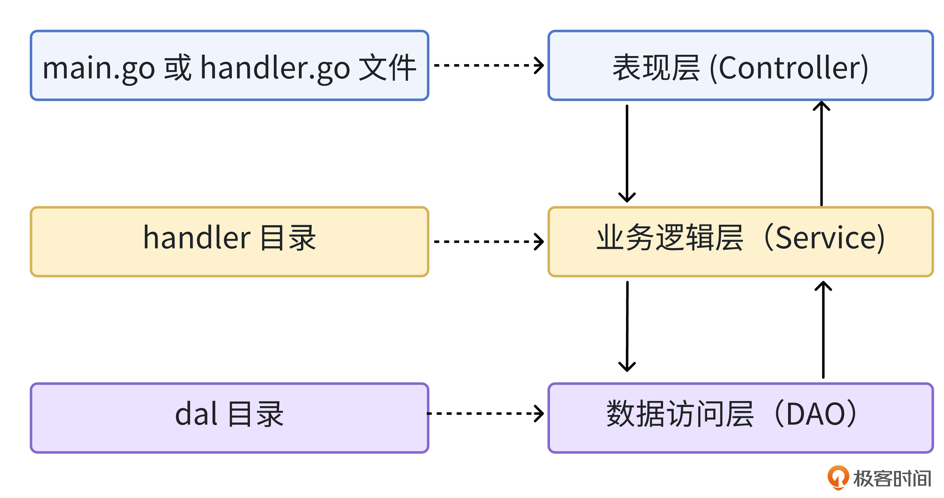 - 数据持久层。与底层MySQL、Redis等数据库交互。相当于我们这里的dal目录。