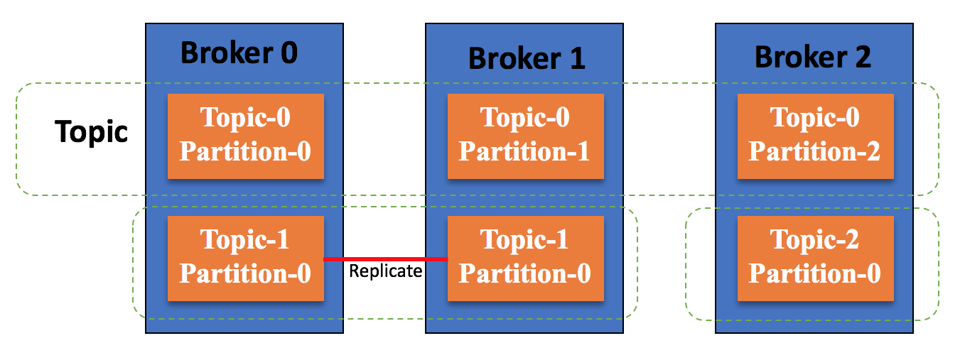 消息数据以Partition(分区)进行存储,一个Topic(主题)可以由多个Partition进行存储,Partition可以分布到多个Broker中;同时,Kafka还提供了Partition副本机制(对分区存储的信息进行备份,比如Broker 1中的Topic-1 Partion-0是对Broker 0上的Topic-1 Partition-0进行的备份),从而保证了消息存储的可靠性。