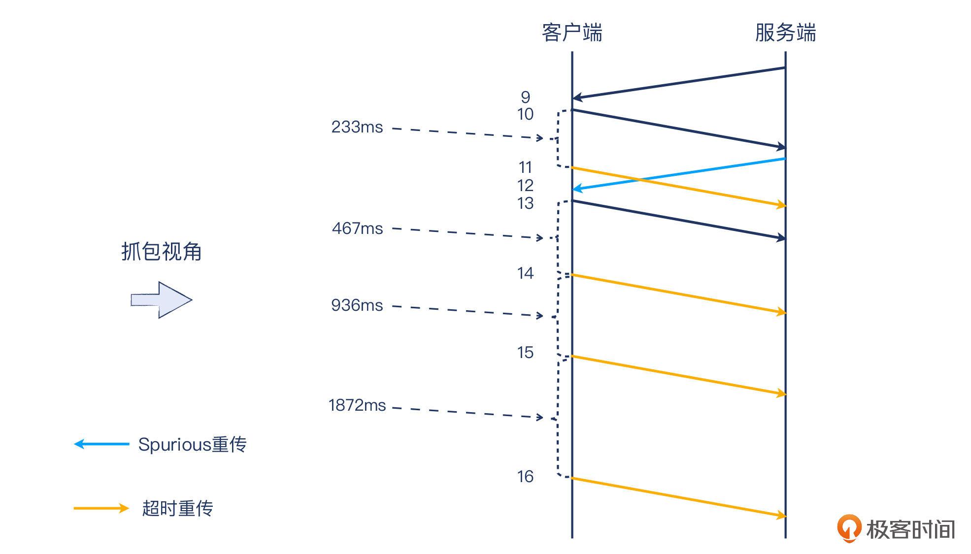 显然,图中黑底红字的报文就是一系列的重传,而且都是超时重传。你如果仔细看了这个文件,可能会指出:“老师不对,这里的12号报文是Spurious重传,不是超时重传”。但是听完我后面的分析,你应该会同意我的观点:这个本质上也是超时重传。
