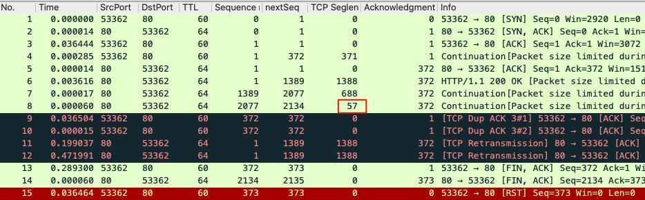 你有没有发现,这57个字节,其实正是前面抓包文件截图里的8号报文的大小,也就是说这57字节的报文确实被服务端收到了,并在随后回复的SACK报文中得以体现。这里我们再看一眼这57字节的报文在抓包文件中的位置: